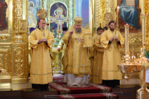 Его Преосвященству сослужили: протоиерей Антоний Савенков, иерей Николай Соловьев, иерей Сергий Петров, иерей Александр Болденков, протодиакон Константин Захаров, диакон Сергий Дмитров.