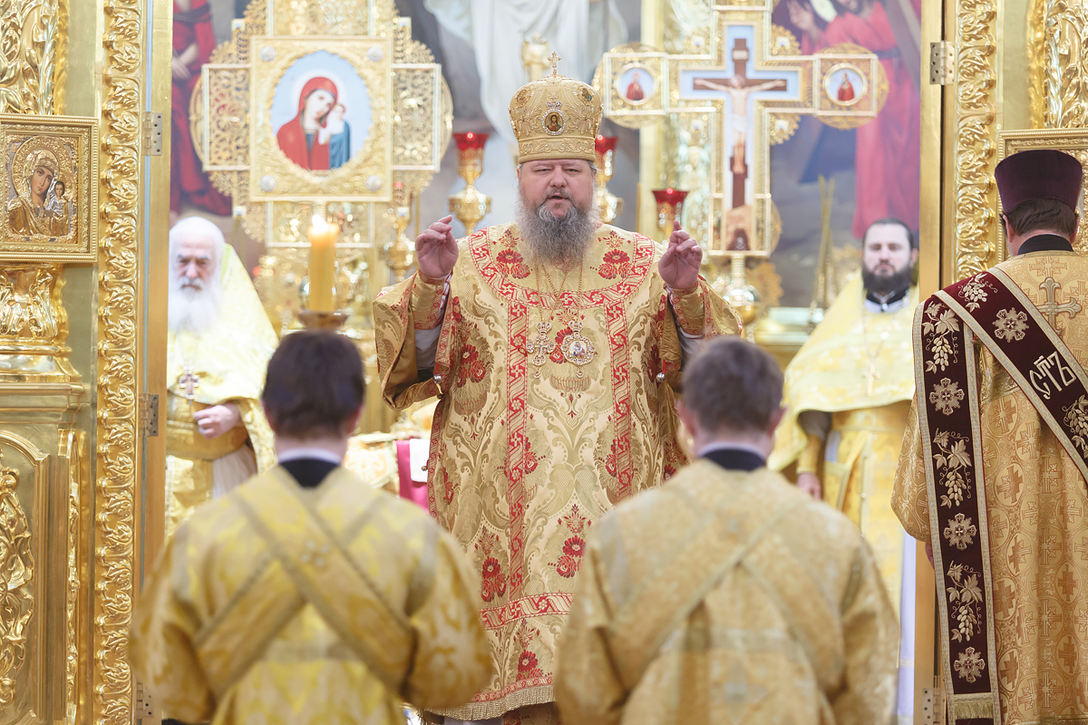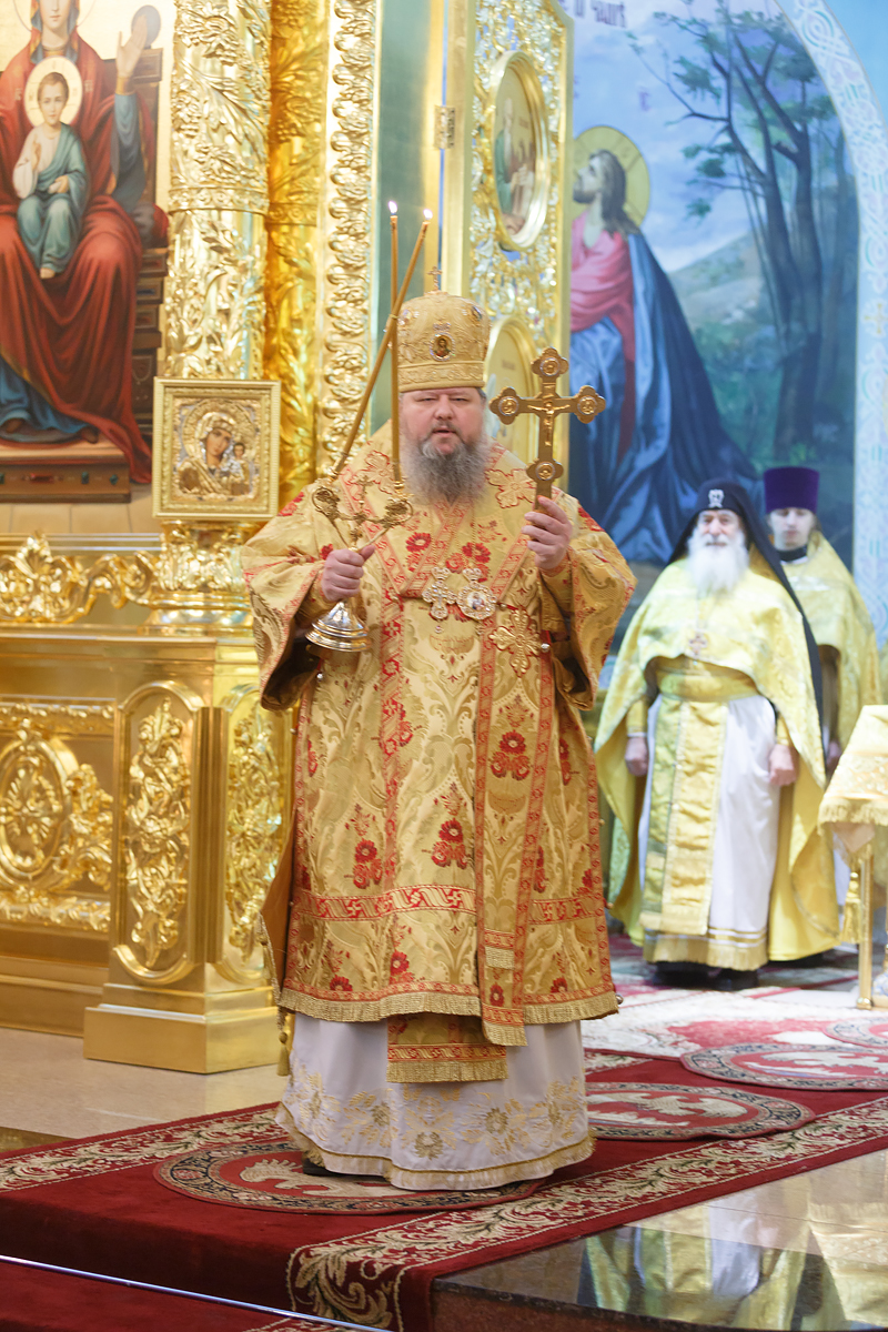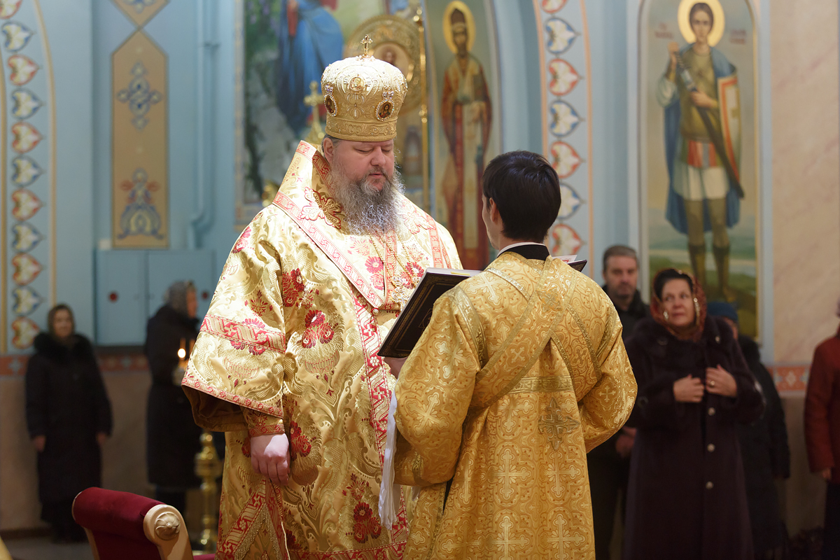 Его Преосвященству сослужили: протоиерей Антоний Савенков, схиархимандрит Пантелеимон (Дудник), иерей Сергий Дмитров, иерей Николай Соловьев, иерей Сергий Петров, иерей Александр Болденков, протодиакон Константин Захаров. По окончании литургии перед иконой священномученика Константина Верецкого, прославленного в лике святых 7 декабря 2018 года в городе Ростове-на-Дону, было совершено славление. После этого Преосвященный владыка с амвона зачитал краткое житие священномученика Константина и обратился к прихожанам со словами назидания.