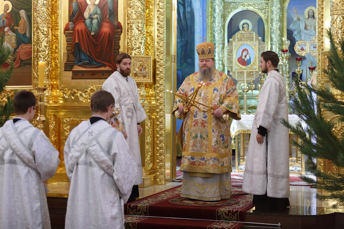 Его Преосвященству сослужили: иерей Роман Нихаев, иерей Сергий Дмитров, иерей Николай Соловьев, иерей Сергий Петров, иерей Александр Болденков, иерей Антоний Беспалов, протодиакон Константин Захаров. После Евангельского чтения на литургии Преосвященный владыка произнес проповедь. По окончании богослужения перед иконой Рождества Христова было совершено славление.