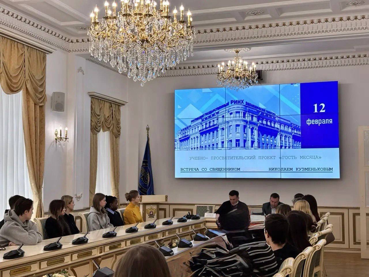 12 февраля в Ростовском государственном экономическом университете (РИНХ) прошла встреча руководителя миссионерского отдела Волгодонской епархии иерея Николая Кузменькова со студентами и преподавателями в рамках учебно-просветительского проекта университета «Гость месяца».