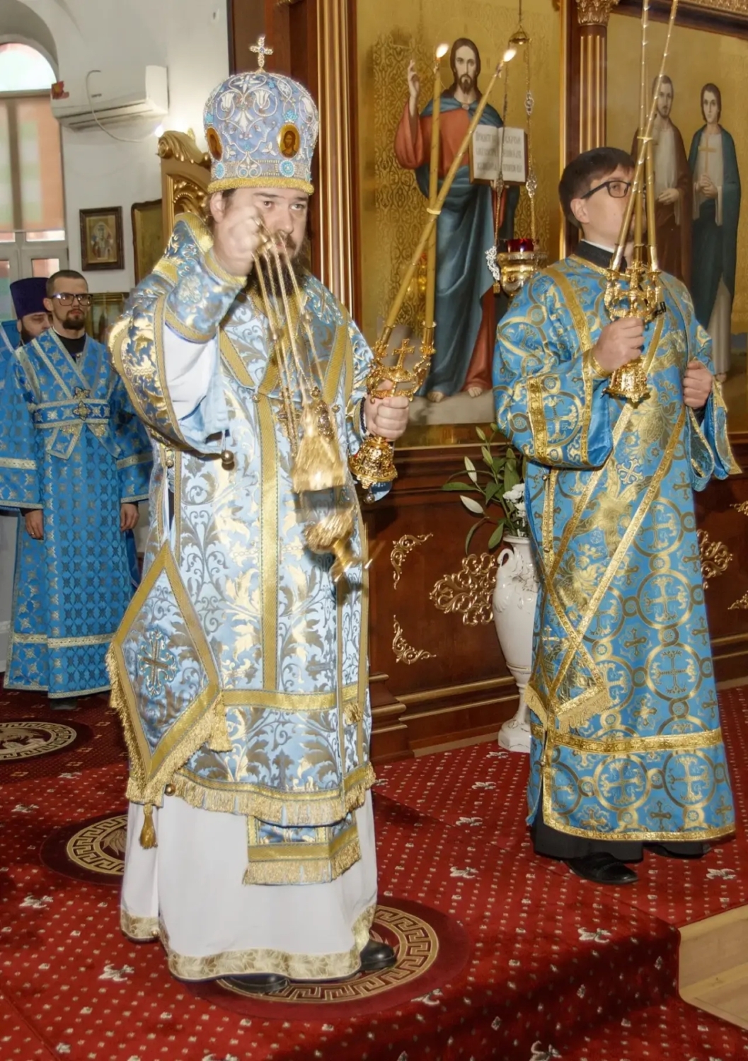 Его Преосвященству сослужили настоятель храма иерей Виктор Фёдоров и клирик храма иерей Георгий Смоляков. За богослужением молились прихожане и казаки Великокняжеского юрта.